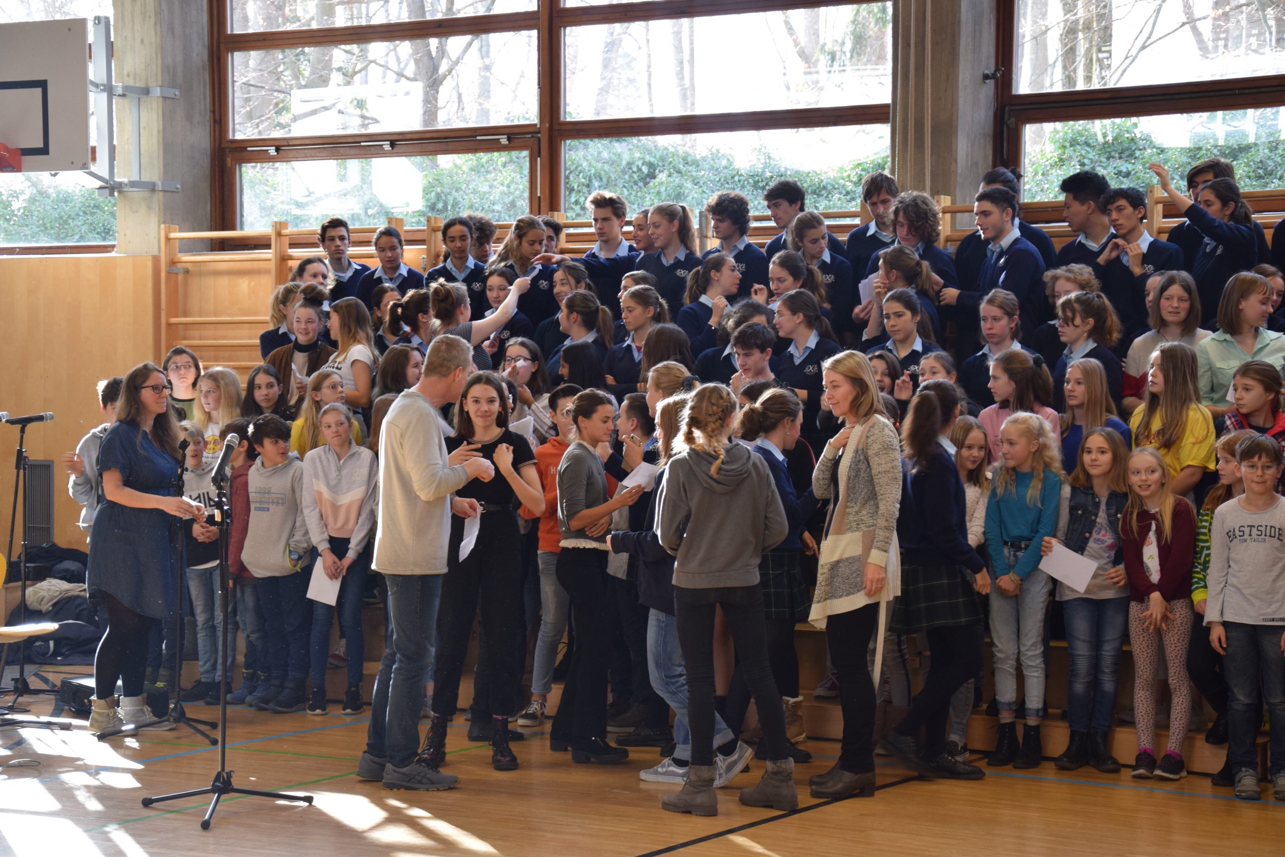 This past Monday, February 3rd GIBS warmly welcomed nearly 100 music students from the St. Andrew’s Scot School, a private K-12 bilingual school located in Buenos Aires, Argentina.  St. Andrew’s students who play in the school band and sing in the chorus have been ‘on tour’ over their summer holidays, and we were very happy to host them and be treated to an in-house concert!  Anna-Lena Sturb, 6c joined the Argetinian band and jazz band on alto saxophone.  The program ended with our junior and senior choirs performing ‘Wann du durchgehst durchs Tal’ which featured select students from both choirs performing a verse together as a solo, alongside GIBS staff members Agni Psilinakis and Peter Hois.  To close the concert, both choirs performed ‘Seasons of Love’ under the direction of Argentinian choir director Tomas Merello.