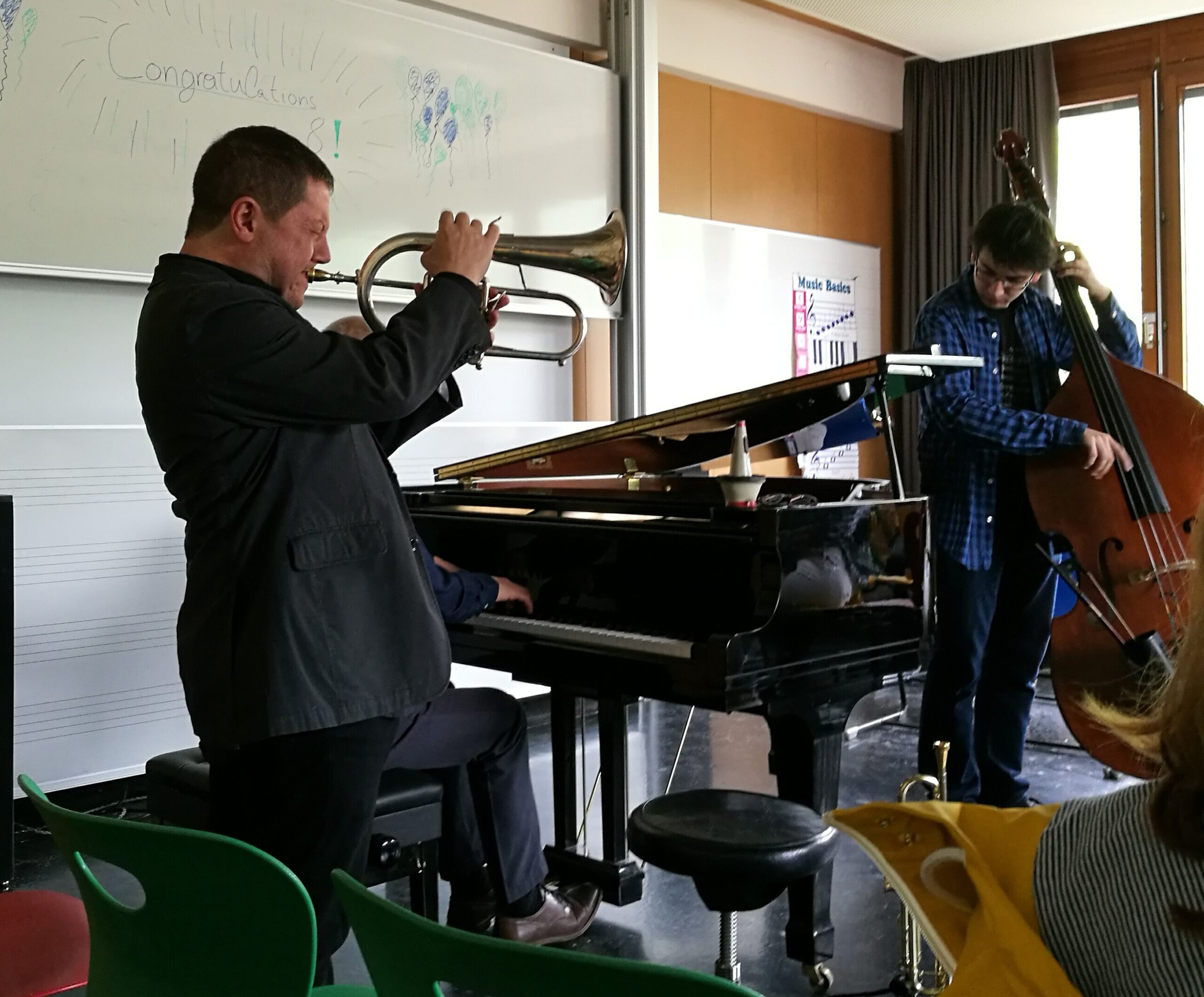 This past winter and spring many lower school classes had the opportunity to attend open rehearsals with both the Recreation Orchestra and the Opera Orchestra here in Graz. We had the special honor to say hello to former GIBS students who were performing with the Recreation Orchestra: Floris Fontin (cello – brother of Fabia Fortin, 4c) and Kathi Liendl (violin), as well as GIBS parents Andrea Molnar (cello – mother of Lina Platzgummer, 2a), Alexander Stock (violin – father of Tina Stock, 1b). Year 8 was treated to a special in house concert and conversation with Univ.Prof for Jazz Trumpet Jim Rotondi and Univ.Prof for Jazz Improvisation Renato Chicco (with help from KUG student Milos Colovic on bass).