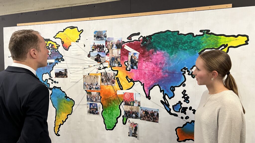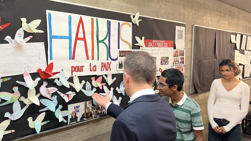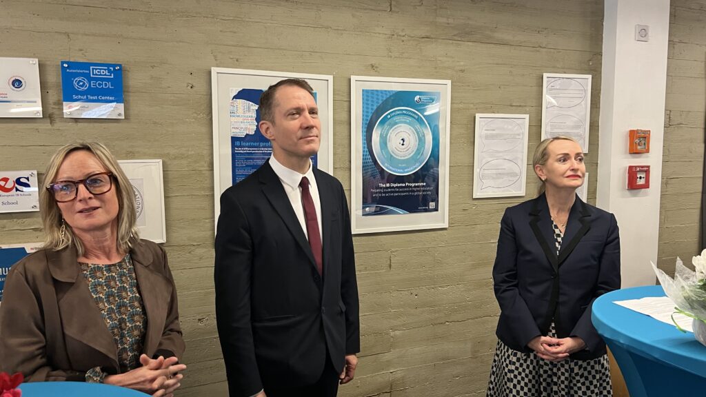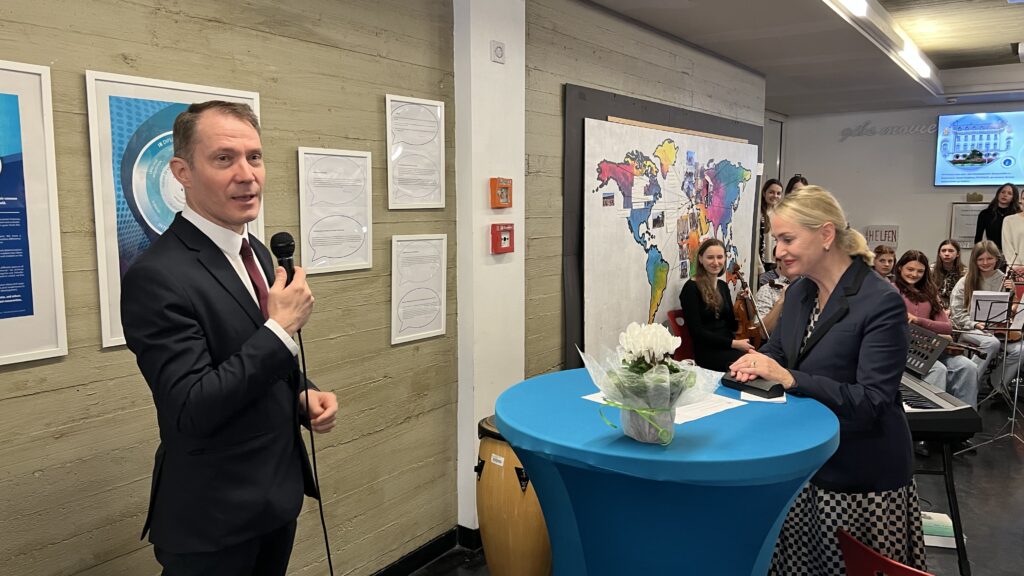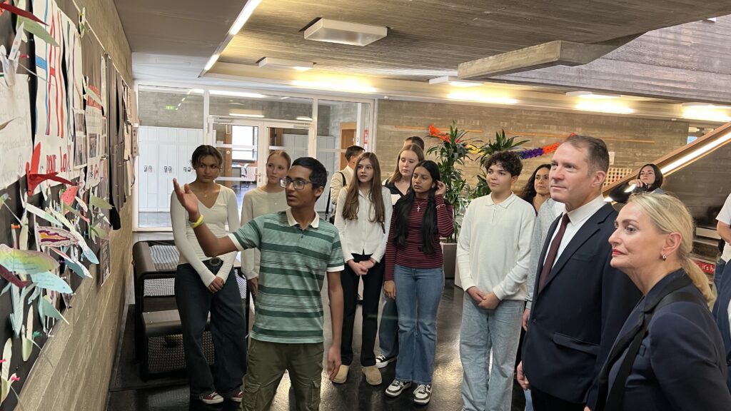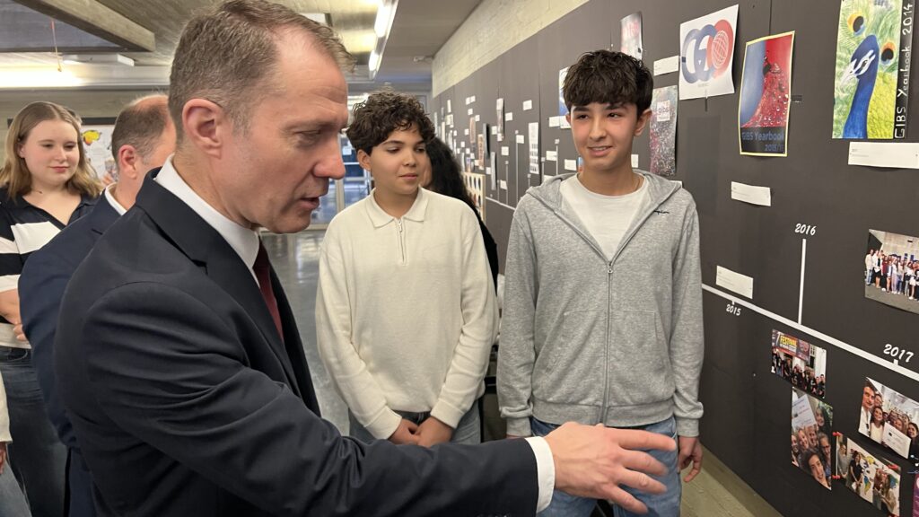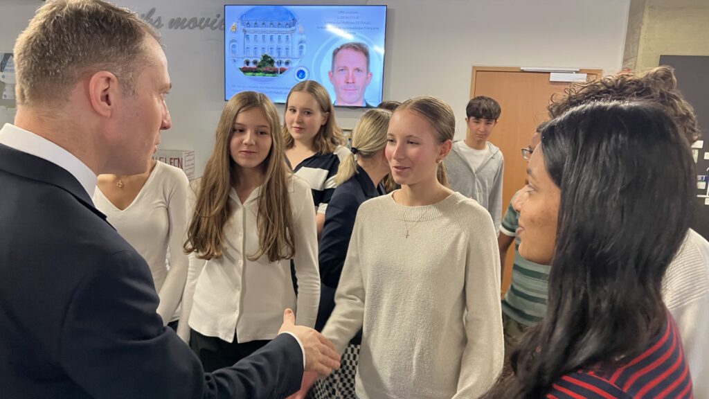 French students in years three and five, along with the junior choir and class 3C, performed the popular song “On Écrit Sur Les Murs” by Kids United for the French ambassador, Monsieur Peyraud, when he visited the school this past February. Later, during the welcome, Noah Schulte 4c performed the French composer Camille Saint-Saëns’s “Allegro Appassionato, Op. 43” on the cello, accompanied by the professional pianist Sakie Harada. After that, students Tilo Bendkis (3B), Olivia Platzgummer (3C), and Flora Karaka sang the classic “Les Feuilles Mortes,” accompanied by Lily Fink (7B) on clarinet.