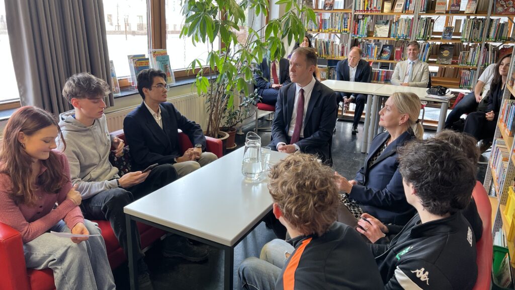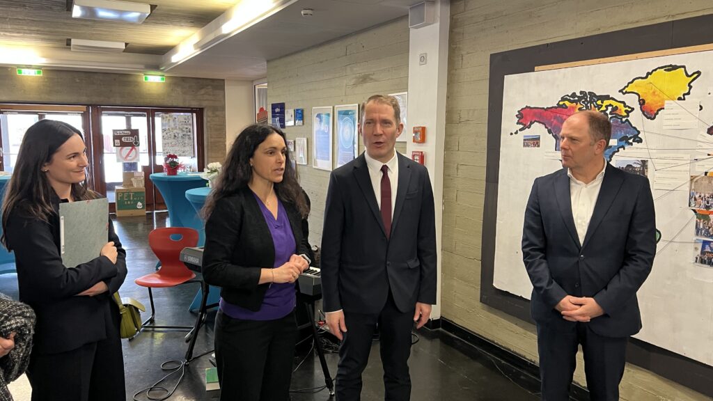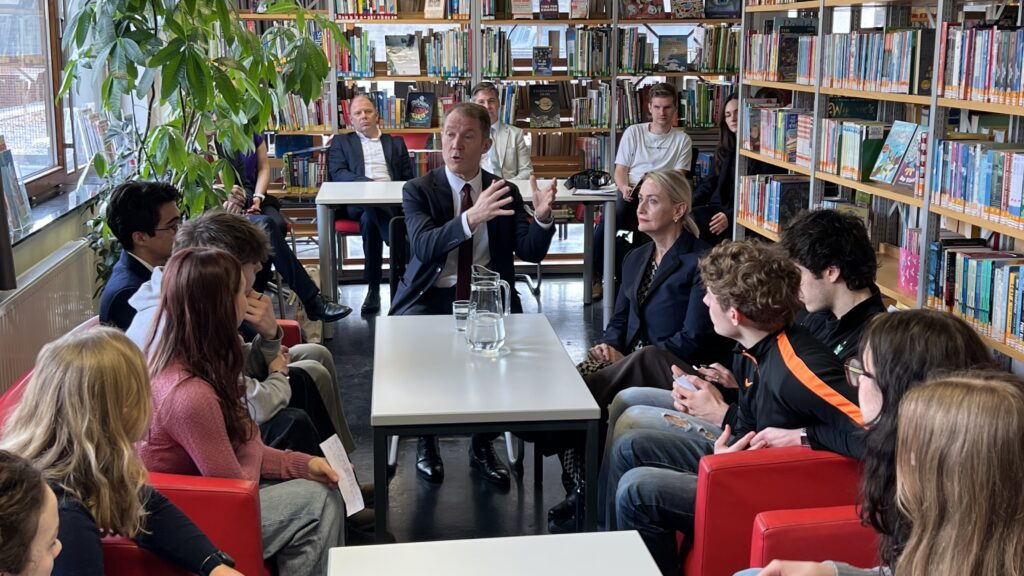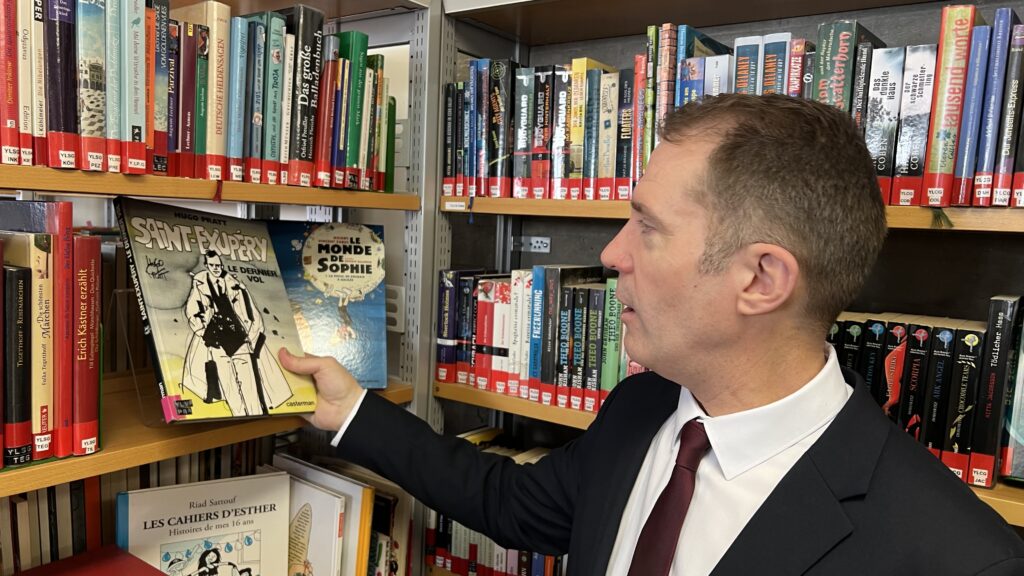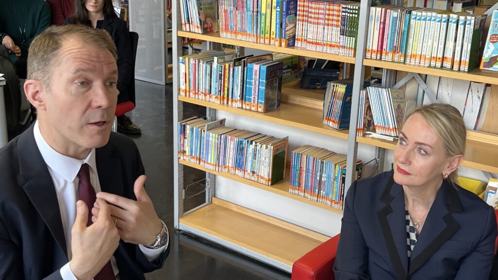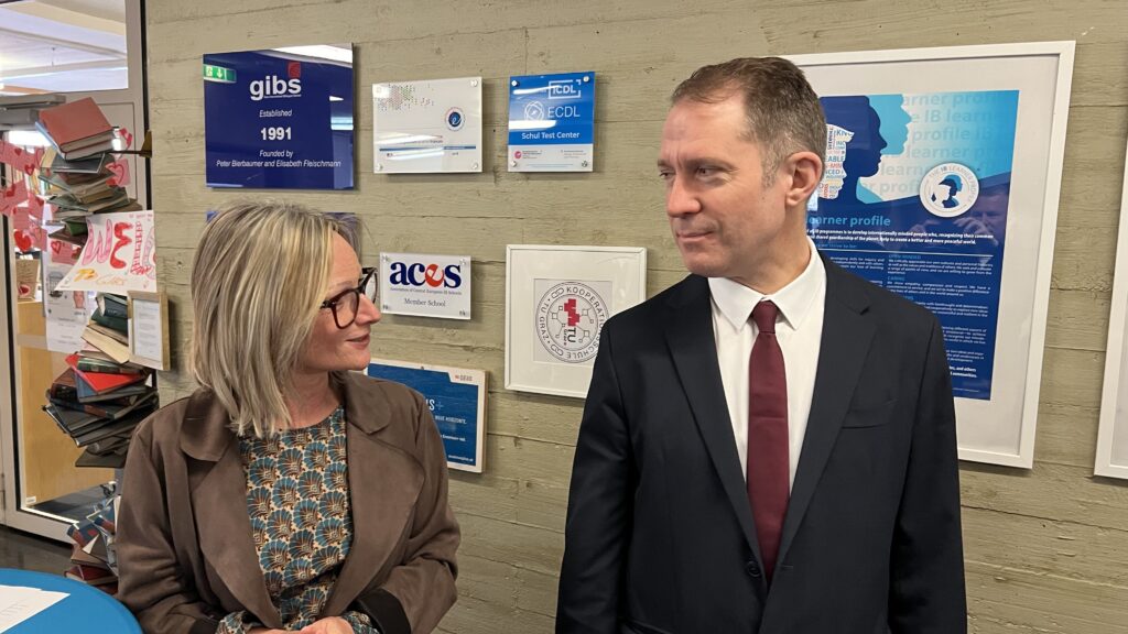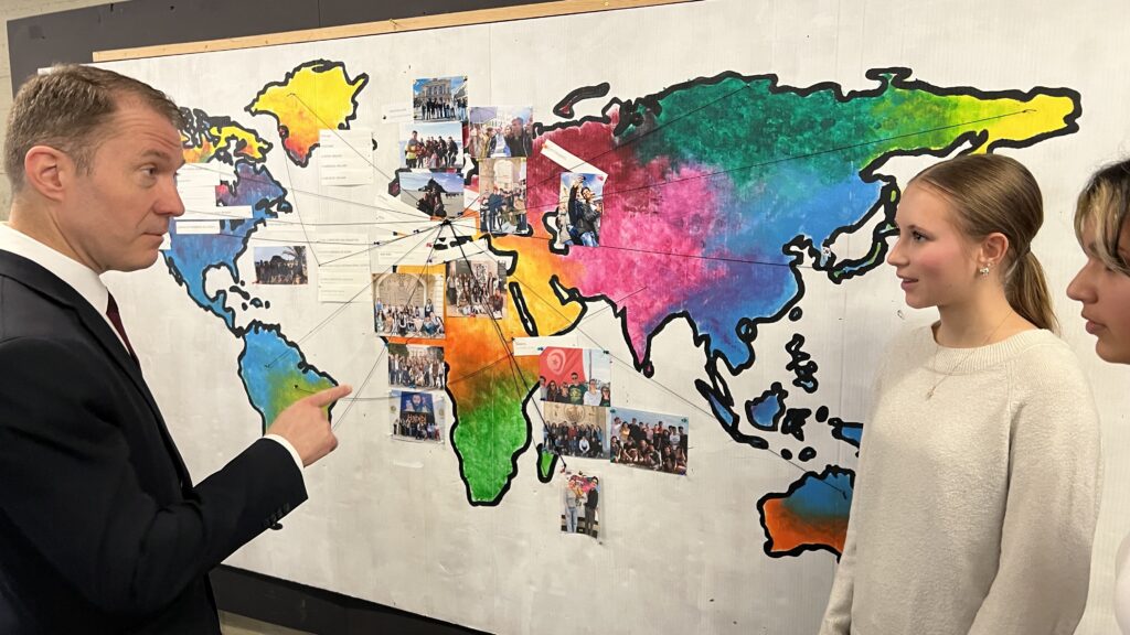 French students in years three and five, along with the junior choir and class 3C, performed the popular song “On Écrit Sur Les Murs” by Kids United for the French ambassador, Monsieur Peyraud, when he visited the school this past February. Later, during the welcome, Noah Schulte 4c performed the French composer Camille Saint-Saëns’s “Allegro Appassionato, Op. 43” on the cello, accompanied by the professional pianist Sakie Harada. After that, students Tilo Bendkis (3B), Olivia Platzgummer (3C), and Flora Karaka sang the classic “Les Feuilles Mortes,” accompanied by Lily Fink (7B) on clarinet.