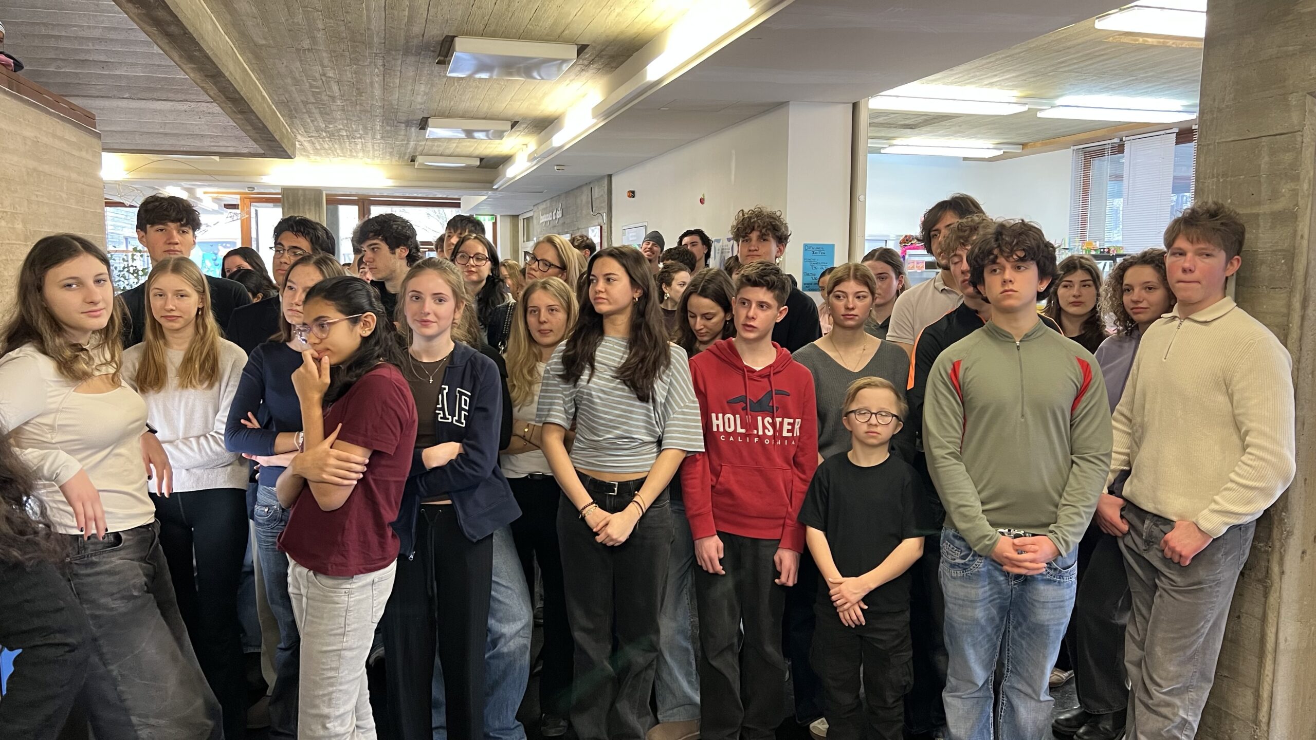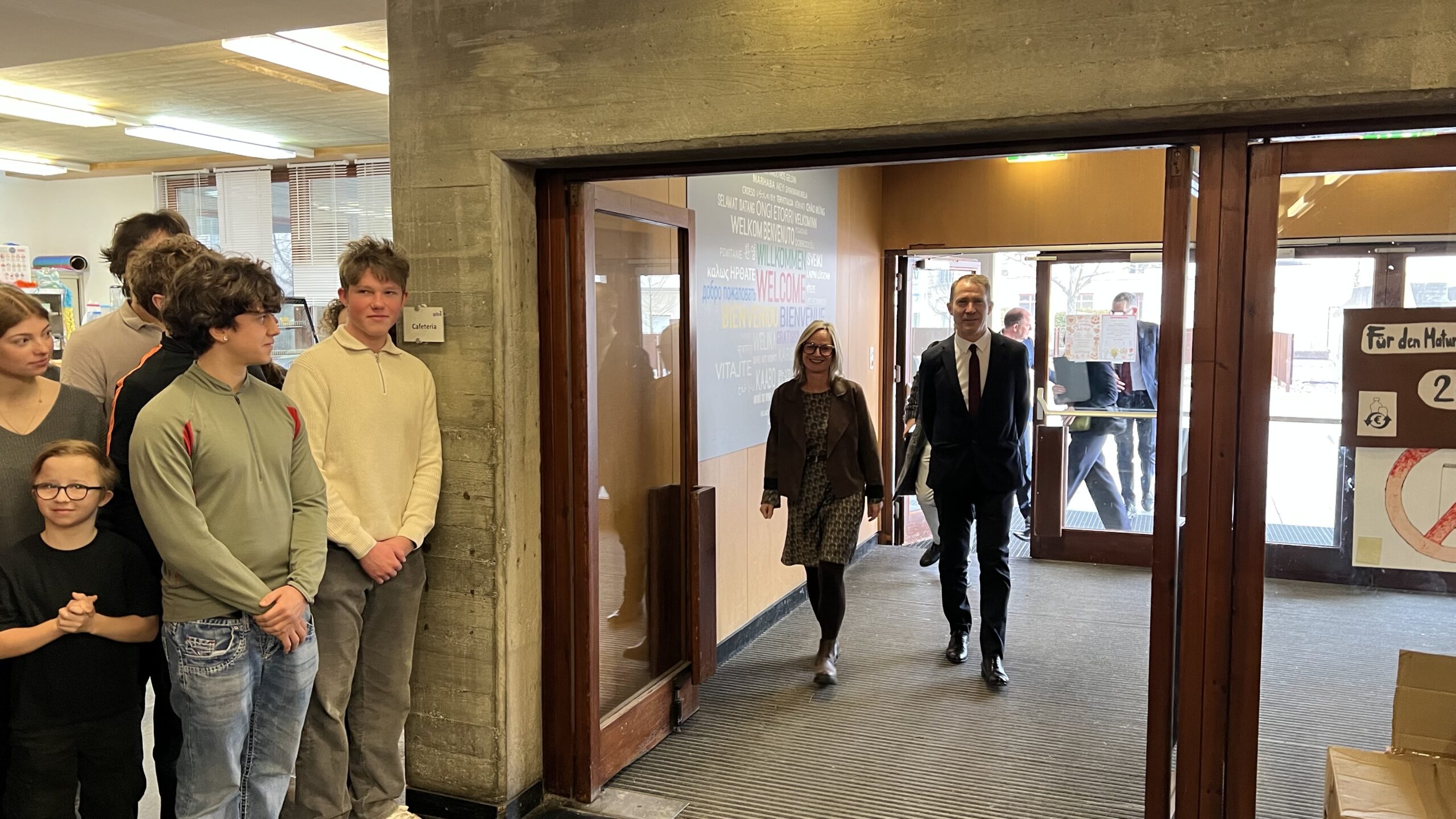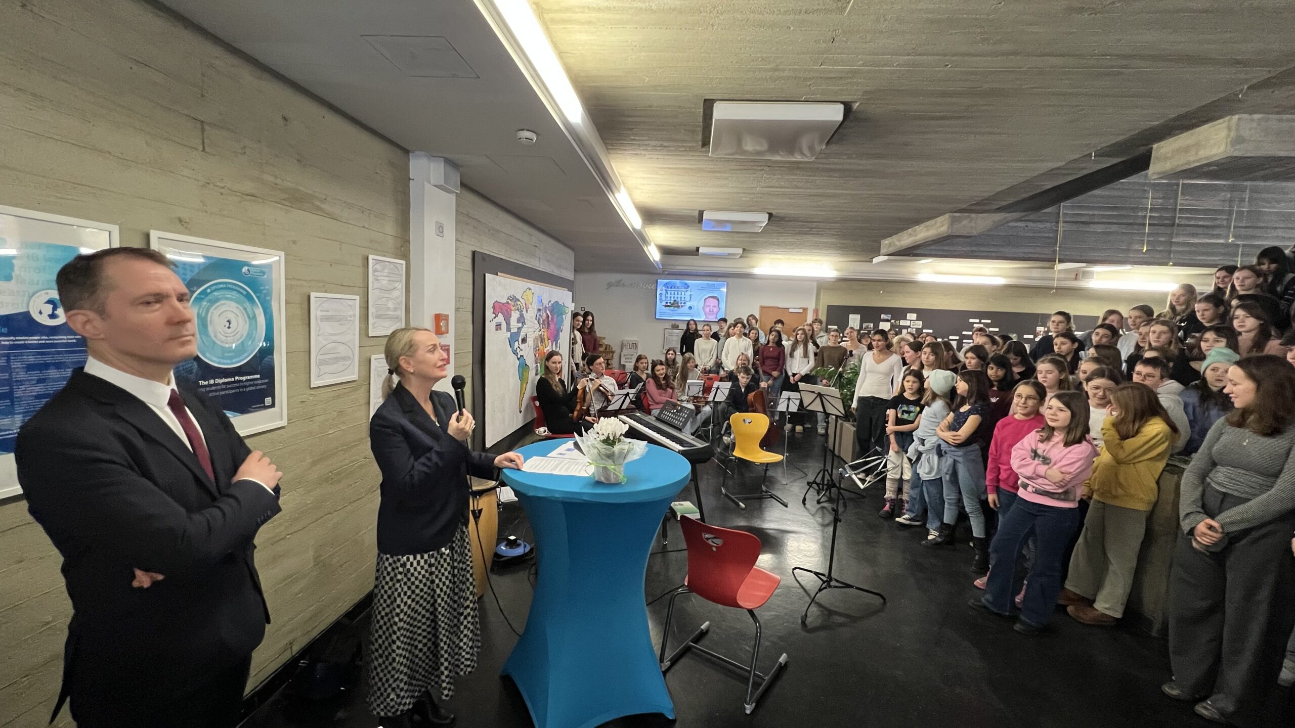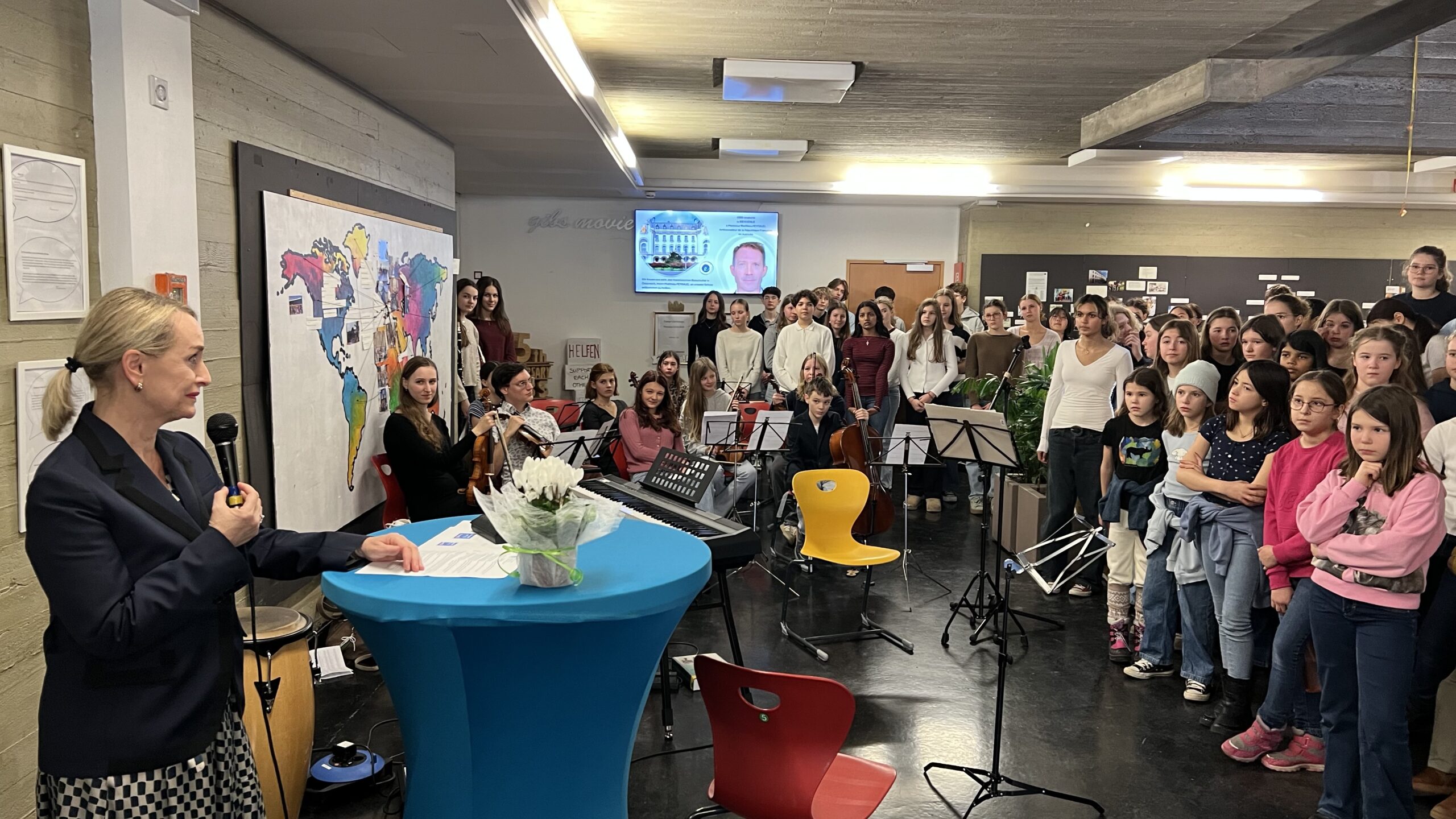 French students in years three and five, along with the junior choir and class 3C, performed the popular song “On Écrit Sur Les Murs” by Kids United for the French ambassador, Monsieur Peyraud, when he visited the school this past February. Later, during the welcome, Noah Schulte 4c performed the French composer Camille Saint-Saëns’s “Allegro Appassionato, Op. 43” on the cello, accompanied by the professional pianist Sakie Harada. After that, students Tilo Bendkis (3B), Olivia Platzgummer (3C), and Flora Karaka sang the classic “Les Feuilles Mortes,” accompanied by Lily Fink (7B) on clarinet.