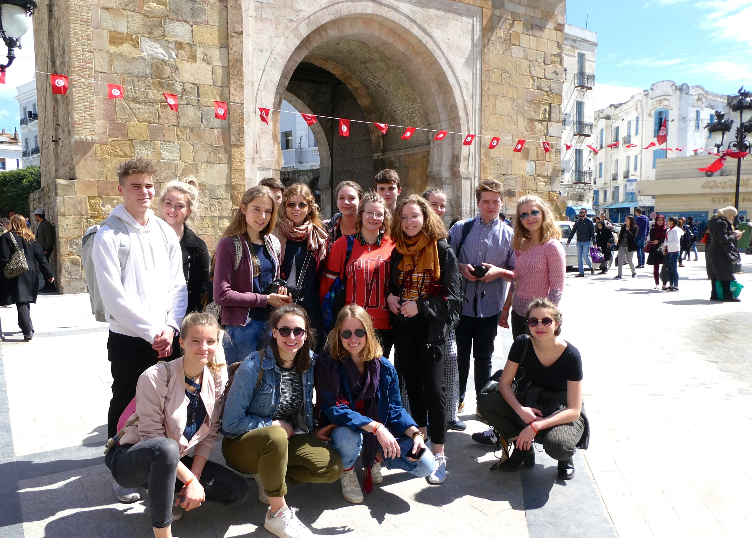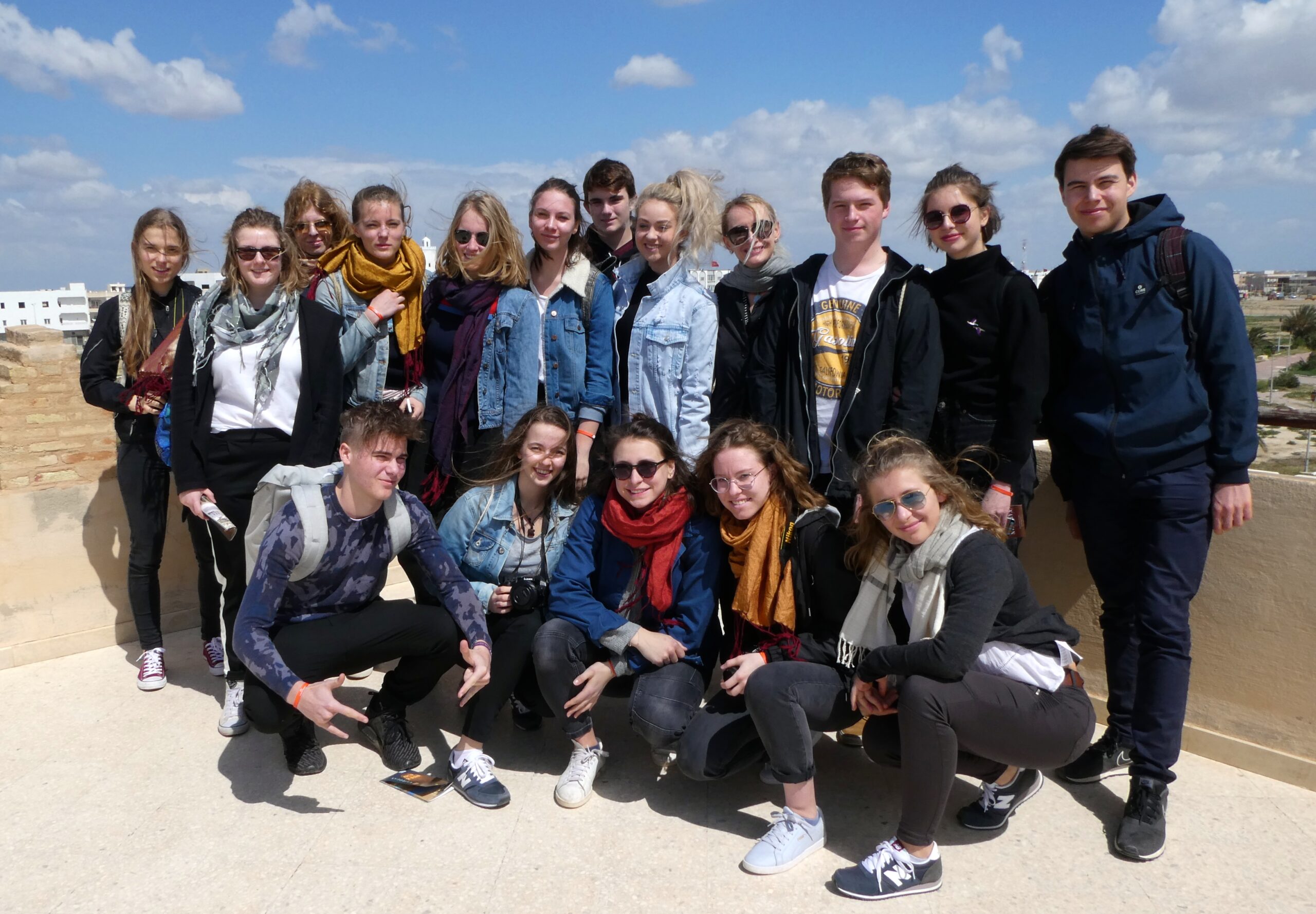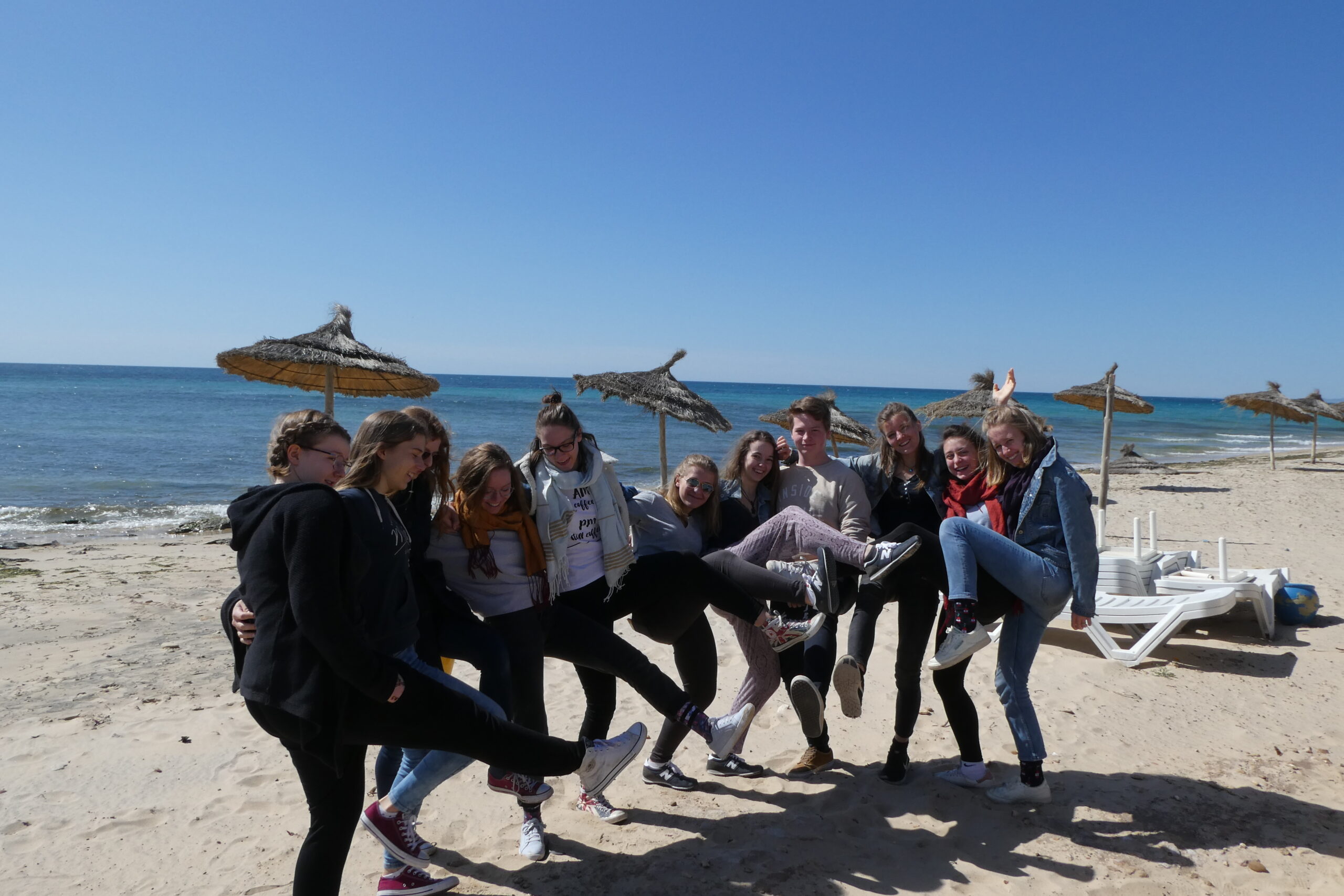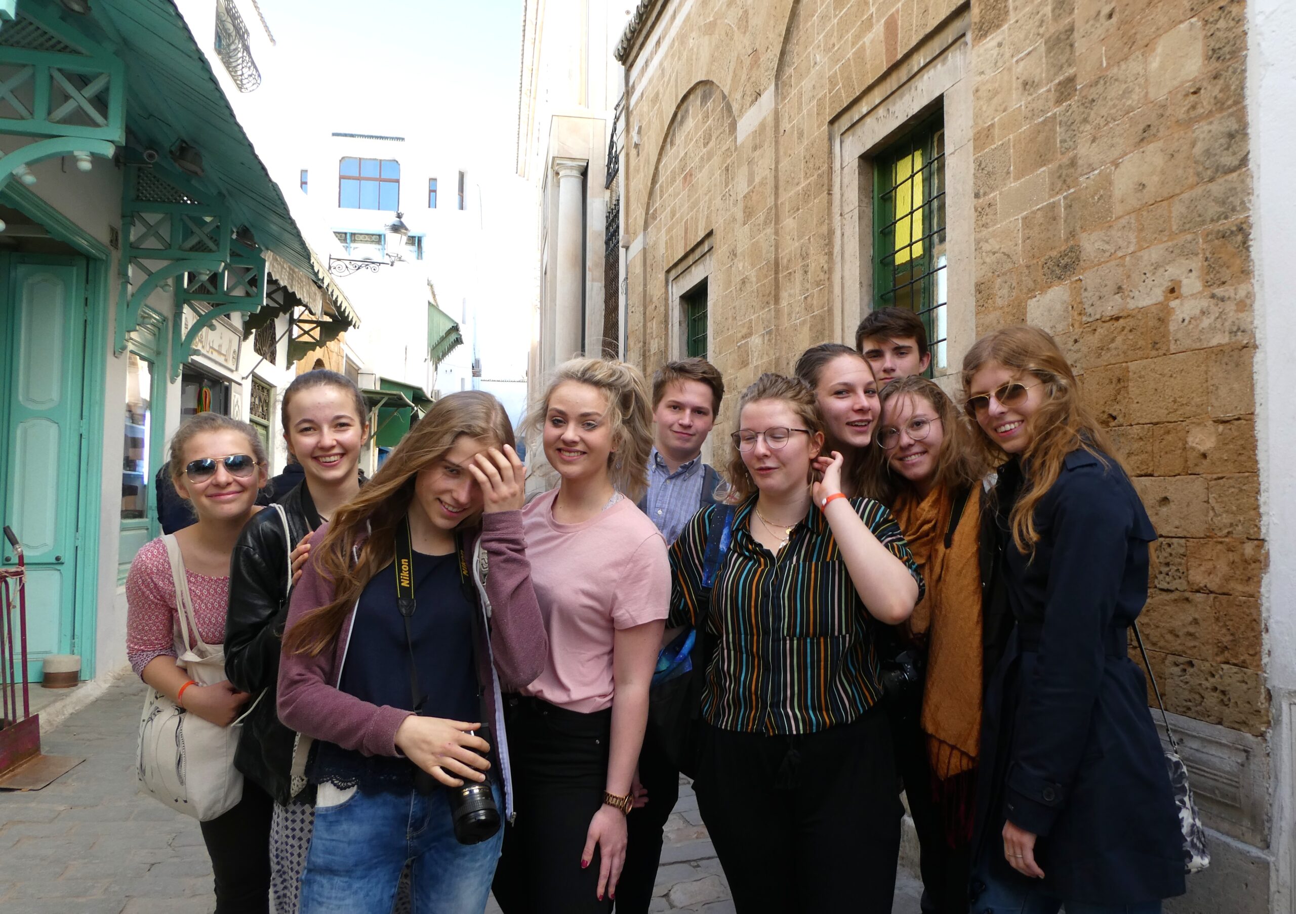 Maintenant quand je pense à la Tunisie, je pense non seulement aux épices, à la mer et aux palmiers, mais aussi à notre voyage inoubliable. Ce que je retiens de ce voyage, c’est avant tout la gentillesse de la plupart des Tunisiens, notamment de notre conducteur de bus très patient, de même que la culture et l’architecture impressionnante. Je n’oublierai jamais nos petites aventures dans le souk, à Hammamet et à la plage. Le lever de soleil en Tunisie était vraiment merveilleux. Nous nous sommes levés très tôt pour le voir et pour prendre des photos. En outre, nous avons eu la chance de faire la connaissance de l’éditeur KARIM BEN SMAIL, très connu au Maghreb, avec qui nous avons parlé de la politique actuelle et de l’histoire tunisienne. Par ailleurs, nous avons vu des ruines romaines à Carthage et nous avons fait une promenade à dos de chameau. À midi, nous avons toujours mangé dans des restaurants tunisiens et bien sûr la nourriture était délicieuse. À la fin de la semaine, il faisait chaud et nous avons nagé dans une mer d’un bleu immense. Je suis ravie d’avoir pu participer à ce voyage et j’espère être bientôt de retour en Tunisie.