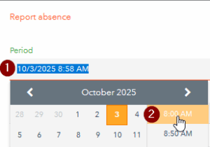 - Enter the absence and edit the date/time field by clicking in the field: Adapt the time to 8 am.